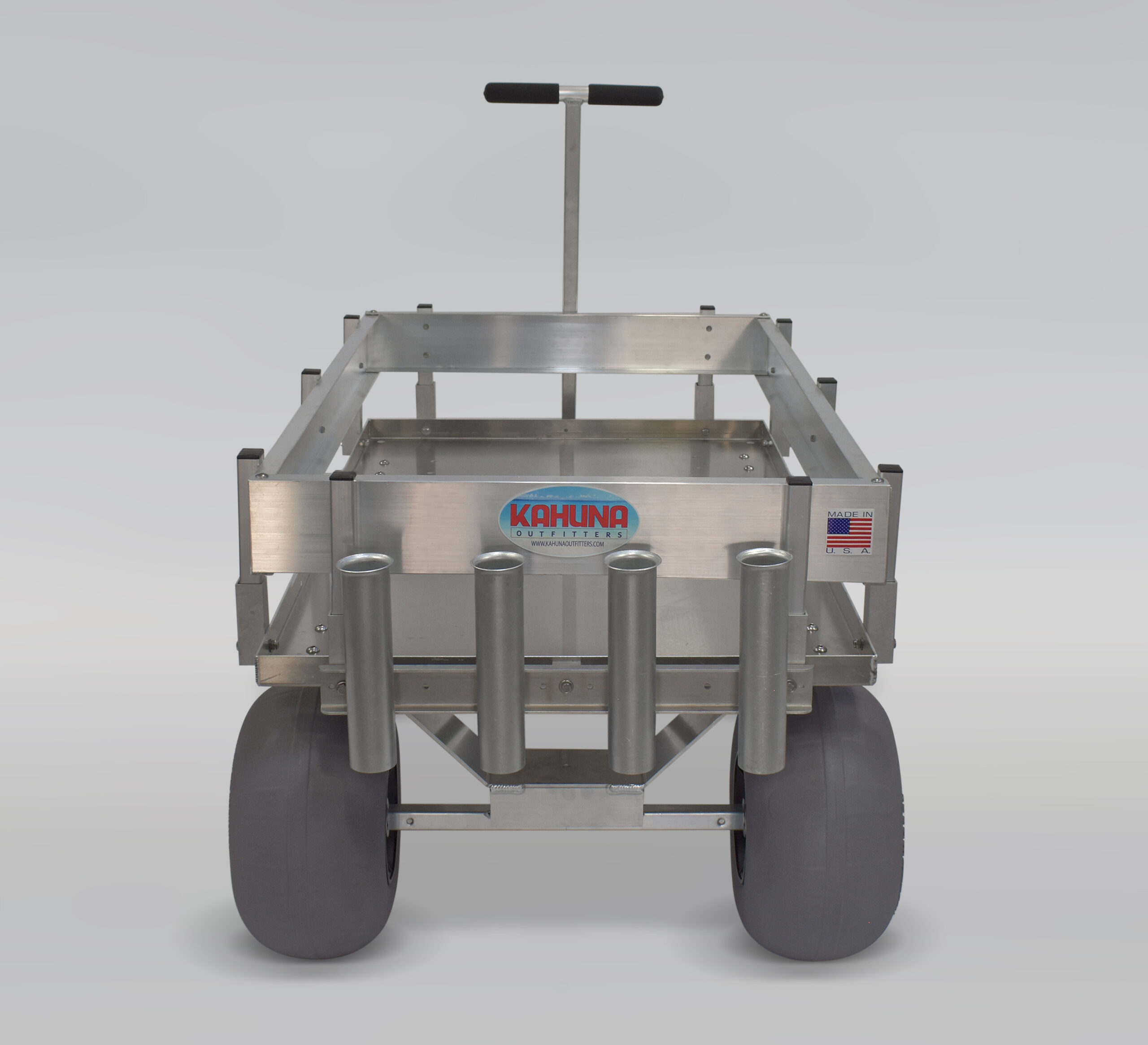 The Big Kahuna Beach Wagon is not only big in size but also in durability and functionality. Fabricated in the USA with a solid aluminum deck, reinforced and lifted undercarriages, and corner drain holes, this wagon is built to withstand the harshest beach conditions and largest loads. The included aluminum four-rod holder, affixed with stainless steel hardware, can be placed on either side of the wagon or the rear, allowing you to customize your fishing experience. And with pre-drilled holes in the deck, you have the freedom to choose the placement of your rod holder rack or add more rod holders as needed.